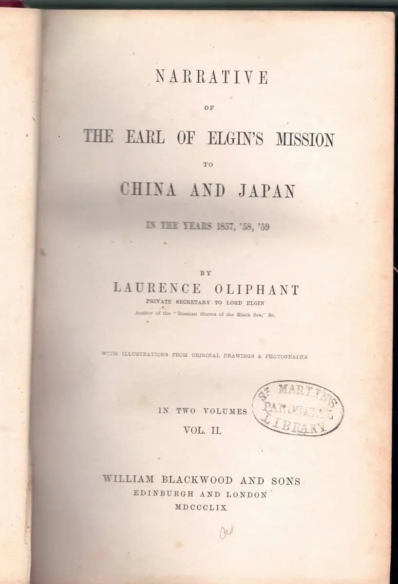 Oliphant, Laurence: Narrative of the Earl of Elgin's Mission to China and Japan in the Years 1857, '58, '59, vol. 2.
