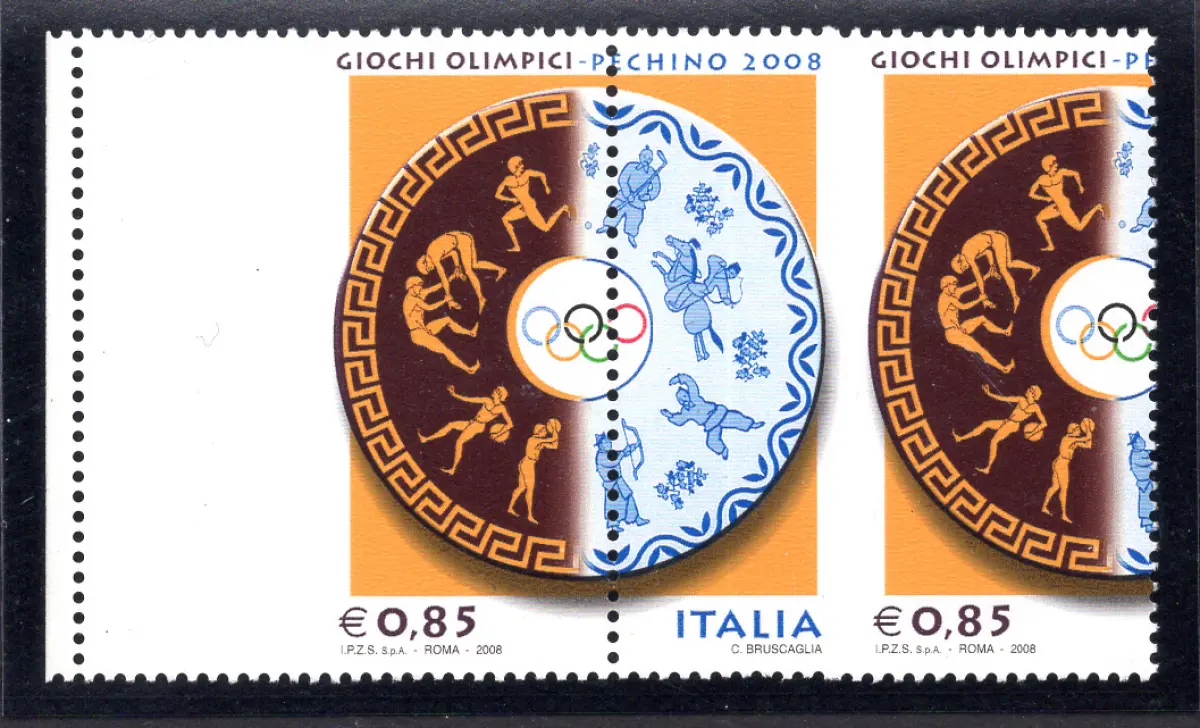MNH - Vollgummi - Olympische Spiele 2008 in Peking Euro 0,85 Nr. 3045a horizontales Paar b. von f. mit stark verschobener vertikaler Verzahnung Italien nach links und Wert rechts - das Exemplar links ohne Schriftzug Italien - neu perfekt mit Vollgummi - auffällig und selten Cod. 2635/WEB