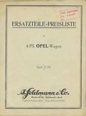 Opel 4 PS Ersatzteil Preisliste 7.1927