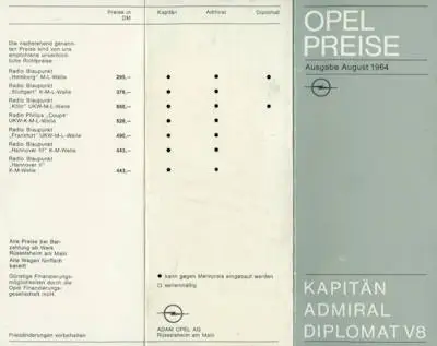 Opel Kapitän Admiral Diplomat Preisliste 8.1964