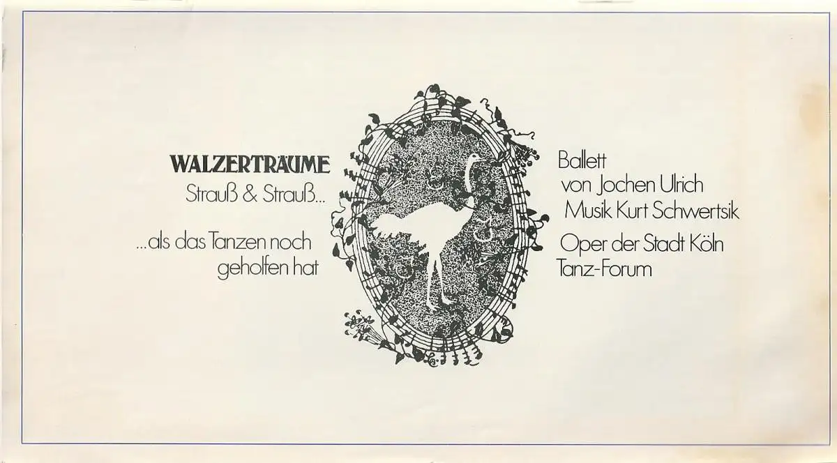 Walzerträume Strauss & Strauss …. Als das Tanzen noch geholfen hat. Ballett von Jochen Ulrich. Musik: Kurt Schwertsik. Musikalische Leitung: Rainer Koch. Bühne und Kostüme: Nadine Baylis. Lichtregie: David Hersey. Mitwirkende: Ralf Harster, Michael Molnar, Athol Farmer, Jocelyne Mocogni, Francoise Mothes, Heide Tegeder, Wolfgang Kegler, u. a. - Theaterprogramm, Opernprogramm, Ballettprogramm, Musicalprogramm, Konzertprogramm, Theatermemorabilia, Programmhefte Sammlung, deutsche Theatergeschichte.