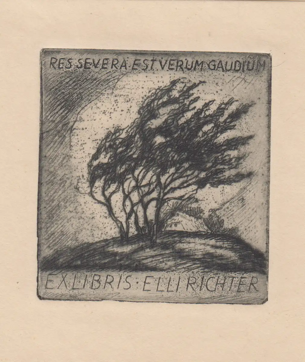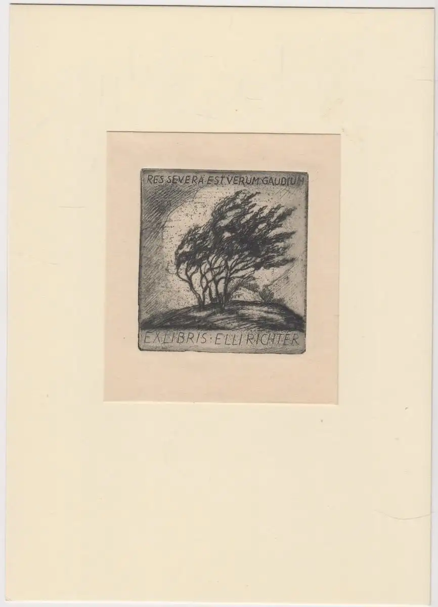 Bemerkungen: Zustand: Blatt minimal berieben // Exlibris für Elli Richter. Die Grafik ist auf Grafikkarton geklebt und hat selbst ein Maß von 10,5 x 9,0 cm. Es Trägt die Inschrift "Res severa est verum gaudium". Künstler unbekannt.