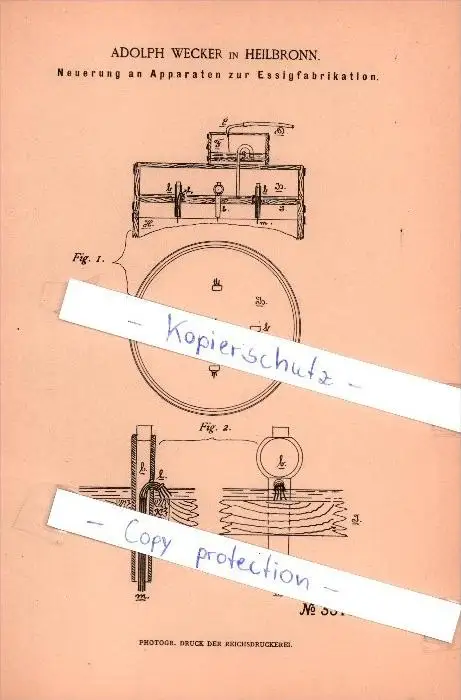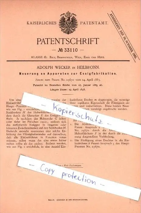Original Patent - Adolph Wecker in Heilbronn , 1885 , Apparate zur Essigfabrikation , Essig !!!