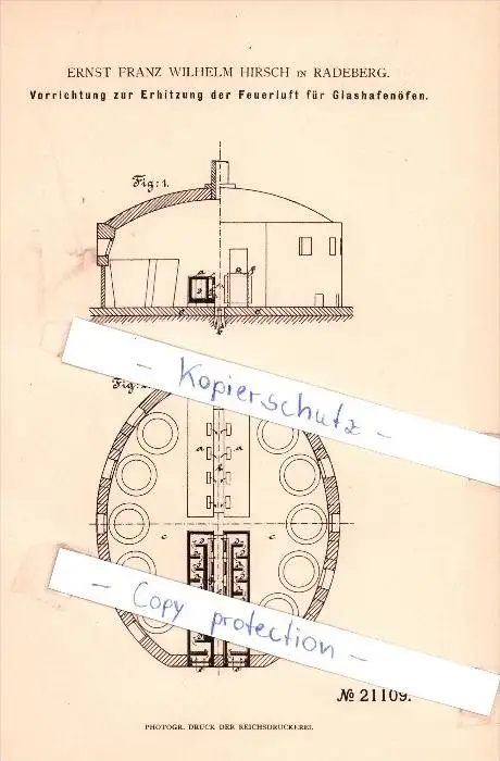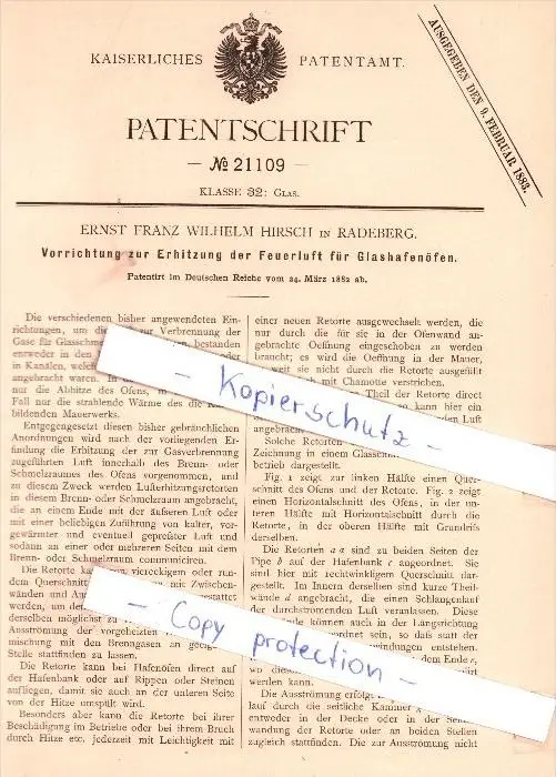 Original Patent - E.F. Hirsch in Radeberg , 1882 , Glashafenöfen , Glas !!!