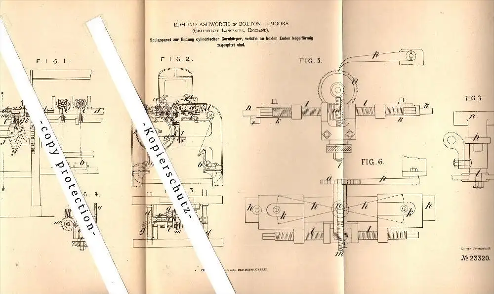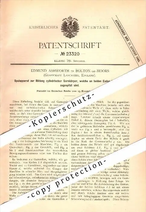 Original Patent - Edmund Ashworth in Bolton le Moors , 1882 , Winding apparatus for spinning !!!