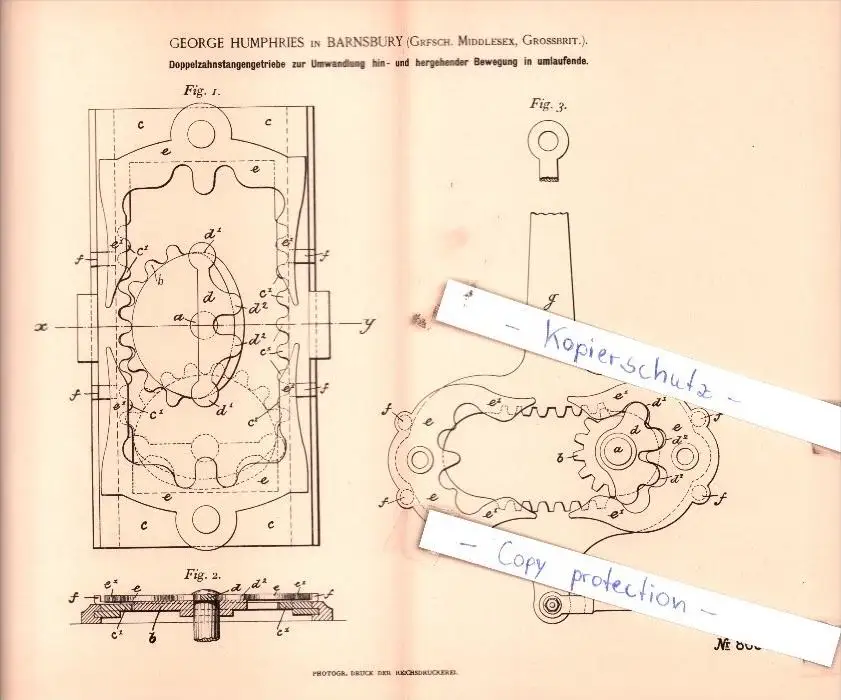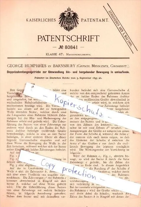 Original Patent - George Humphries in Barnsbury / London, Grossbrit. , 1893 , Getriebe !!!