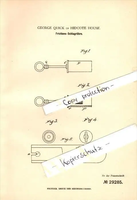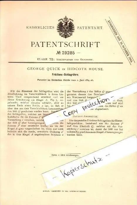 Original Patent - George Quick in Hidcote House , 1884 , Apparatus for firearm !!!