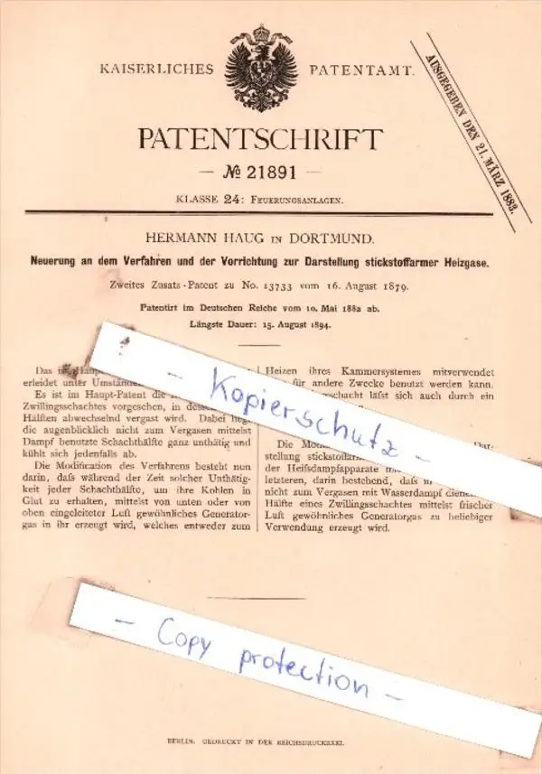Original Patent - Hermann Haug in Dortmund , 1882 , Feuerungsanlagen !!!