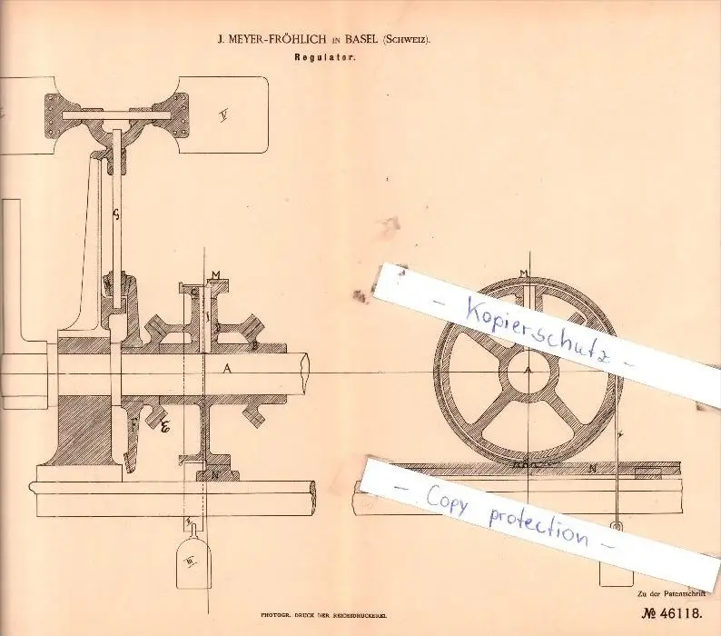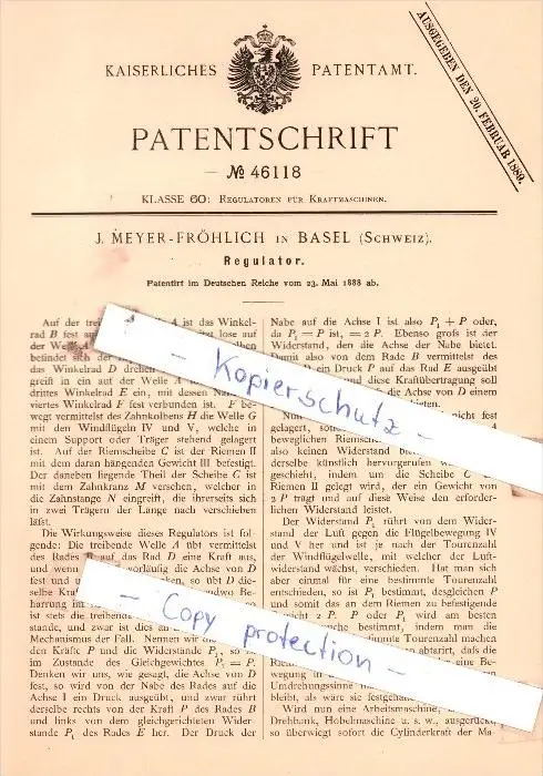 Original Patent - J. Meyer-Fröhlich in Basel , Schweiz , 1888 , Regulator !!!