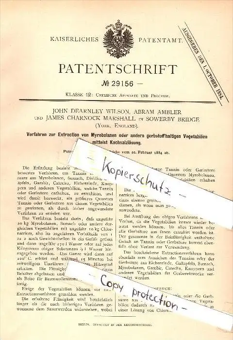 Original Patent - J. Wilson , A. Ambler und J. Marshall in Sowerby Bridge , 1884, Extraction with saline , chemistry !!!