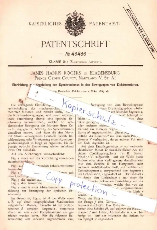 Original Patent - James Harris Rogers in Brandenburg , 1887 , Elektrische Apparate !!!