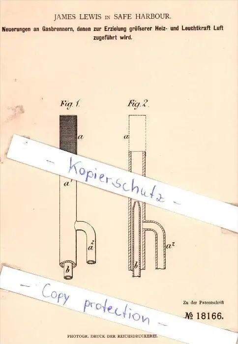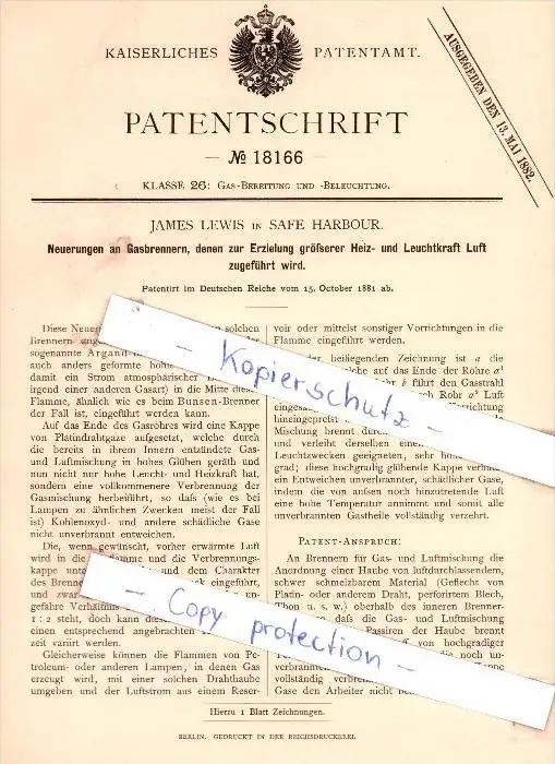 Original Patent - James Lewis in Safe Harbour , 1881 , Neuerungen an Gasbrennern !!!