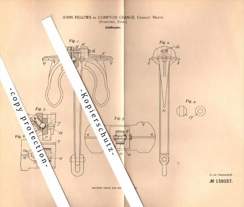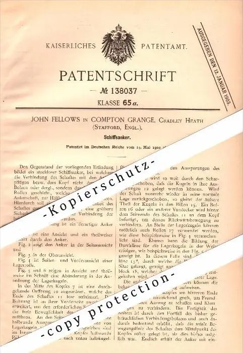 Original Patent - John Fellows in Compton Grange , Stafford , 1902 , ship anchor !!!