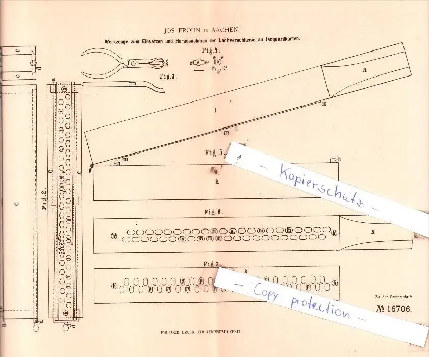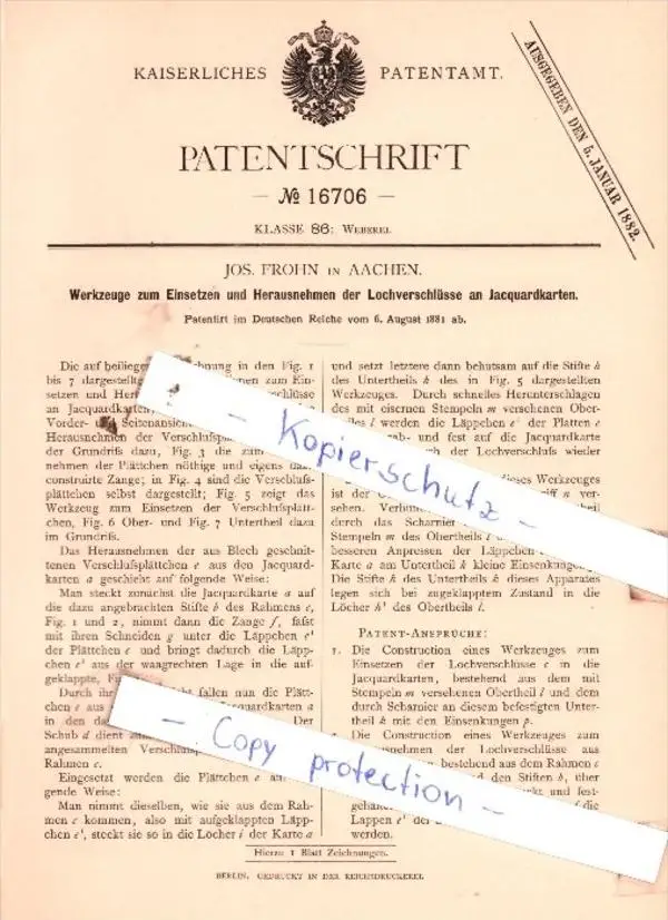 Original Patent - Jos. Frohn in Aachen , 1881 , Weberei !!!