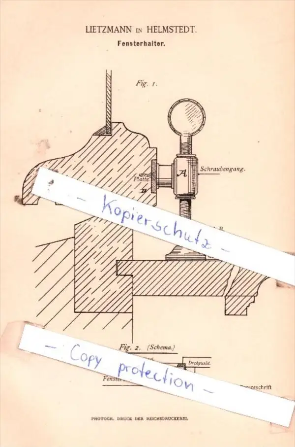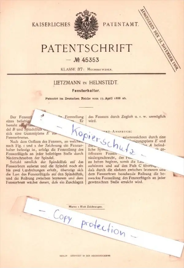 Original Patent - Lietzmann in Helmstedt , 1888 , Fensterhalter !!!