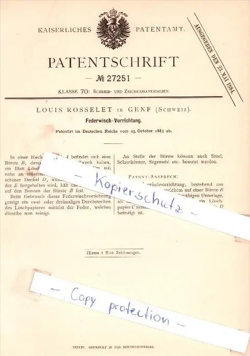 Original Patent - Louis Rosselet in Genf , Schweiz , 1883 , Federwisch-Vorrichtung !!!
