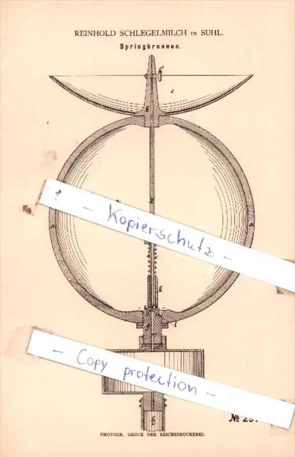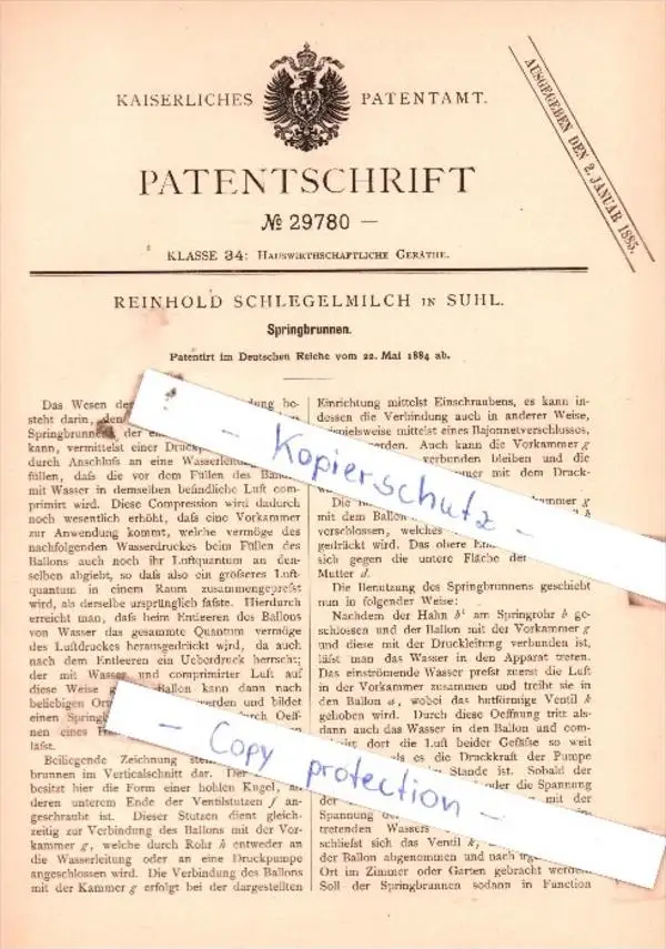 Original Patent - Reinhold Schlegelmilch in Suhl , 1884 , Springbrunnen !!!