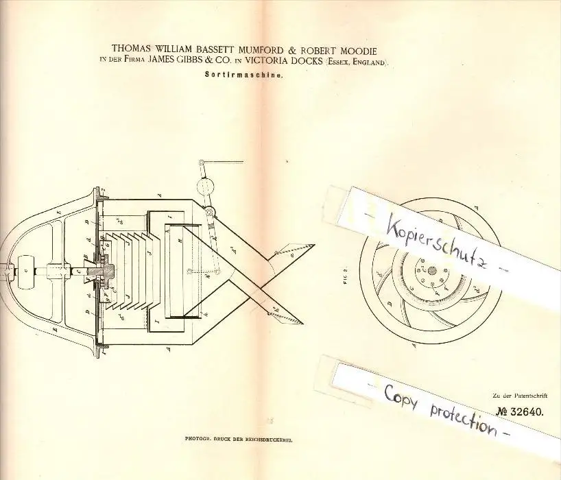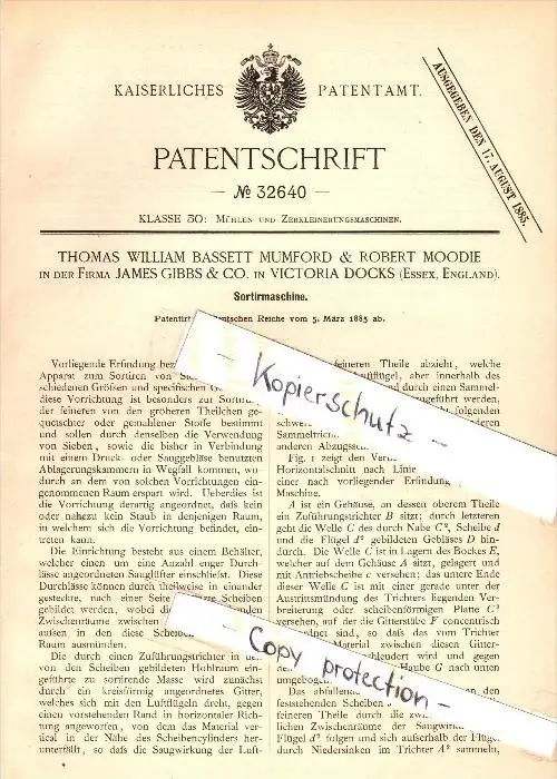 Original Patent - Th.W. Mumford & R. Moodie , Gibbs & Co. in Victoria Dock , 1885 , sorting machine !!!