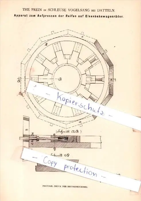 Original Patent - The Prein in Schleuse Vogelsang bei Datteln , 1880 , Aufpressen der Reifen !!!