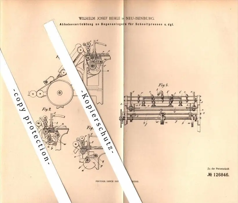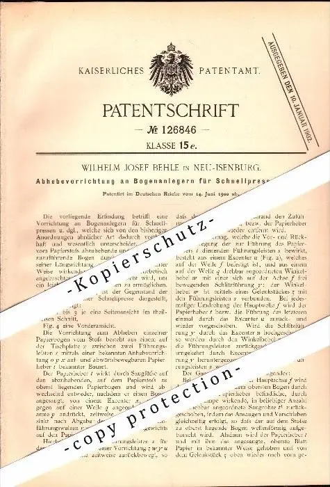 Original Patent - W.J. Behle in Neu-Isenburg b. Offenbach ,1900 , Apparat für Schnellpressen , Presse !!!