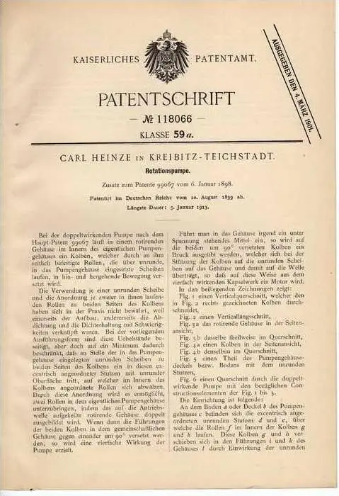 Original Patentschrift - C. Heinze in Kreibitz - Teichstadt , 1899 , Rotationspumpe !!!