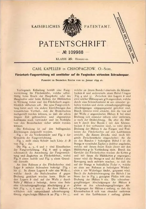 Original Patentschrift - C. Kapeller in Chropaczow , 1899 , Fangvorrichtung für Förderkorb !!!