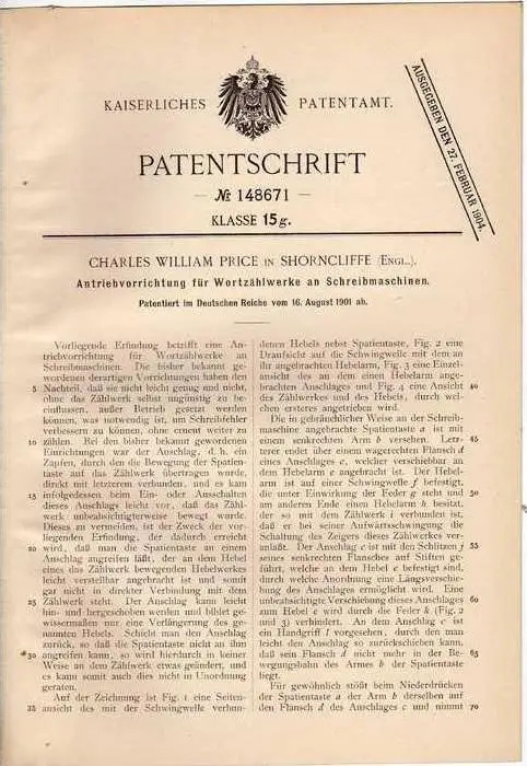 Original Patentschrift - C. Price in Shorncliffe , 1901 , Zählwerk für Schreibmaschine !!!