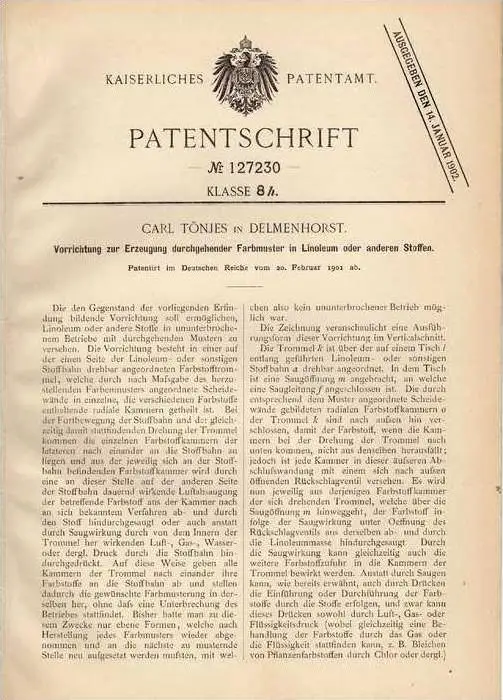Original Patentschrift - C. Tönjes in Delmenhorst , 1901 , Linoleum - Erzeugung , Muster !!!