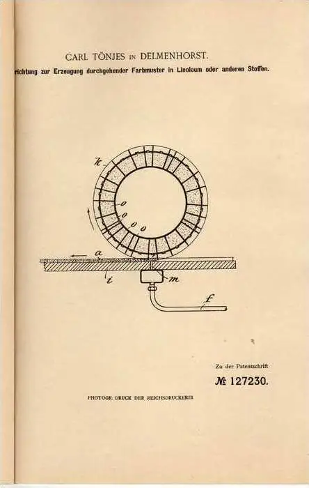 Patent: Vorrichtung zur Erzeugung durchgehender Farbmuster in Linoleum