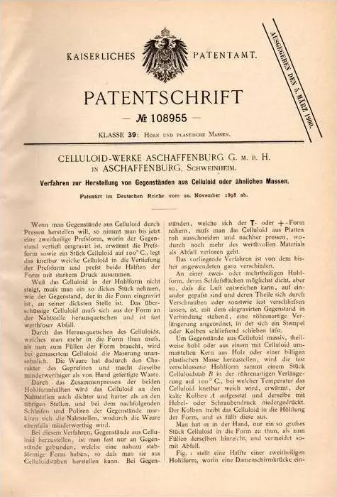 Patent: Verfahren zur Herstellung von Gegenständen aus Celluloid