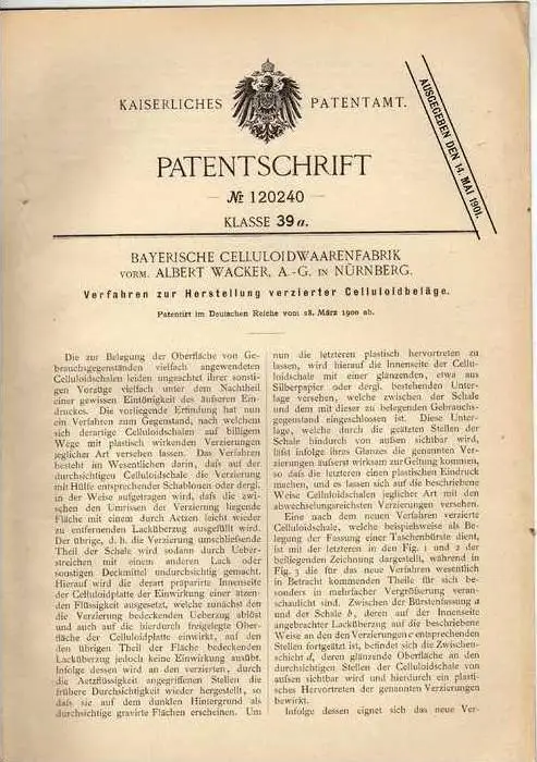 Patentinhaber: Bayerische Celluloidwaarenfabrik , vorm. Albert Wacker AG in Nürnberg