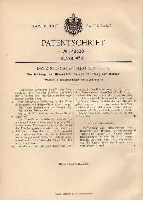 Original Patentschrift - D. Sturmat in Gillanden , 1903 , Vertreiben von Wild aus Höhlen , Jagd , Jäger !!!
