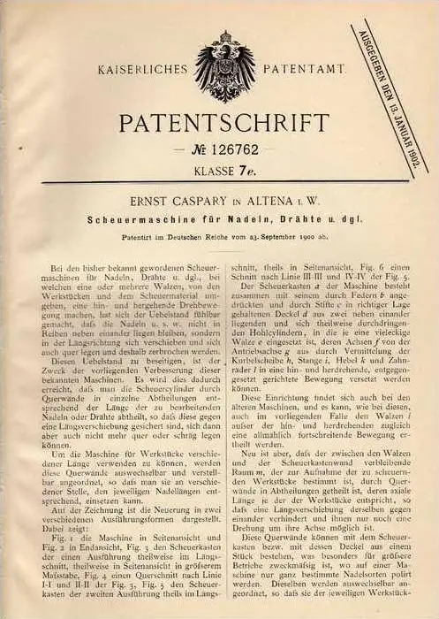 Original Patentschrift - E. Caspary in Altena i.W. , 1900 , Scheuermaschine !!!
