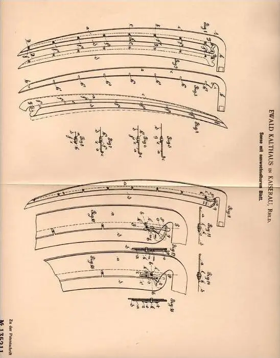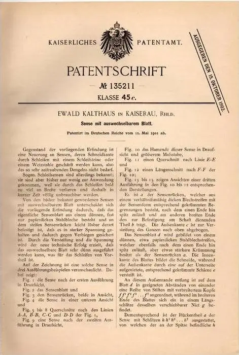 Original Patentschrift - E. Kalthaus in Kaiserau , 1901 , Sense mit auswechselbarem Blatt !!!