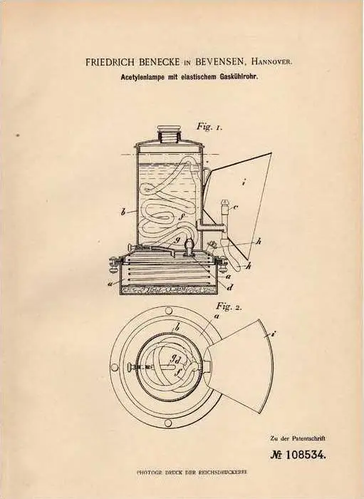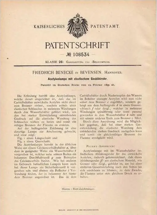 Original Patentschrift - F. Benecke in Bevensen b. Hannover , 1899 , Acetylenlampe mit Gaskühlrohr !!!