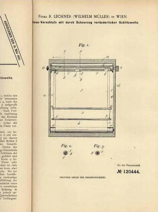 Patent: Rouleau Verschluß mit durch Schnurzug veränderlicher Schlitzweite