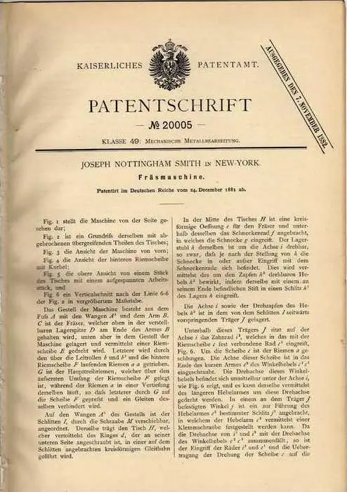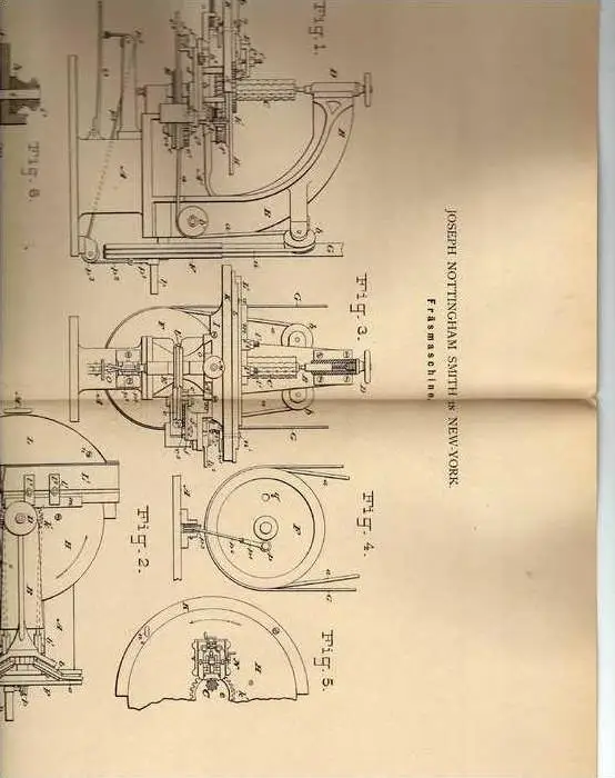 Original Patentschrift - Fräsmaschine , 1881 , J. Nottingham in New York !!!