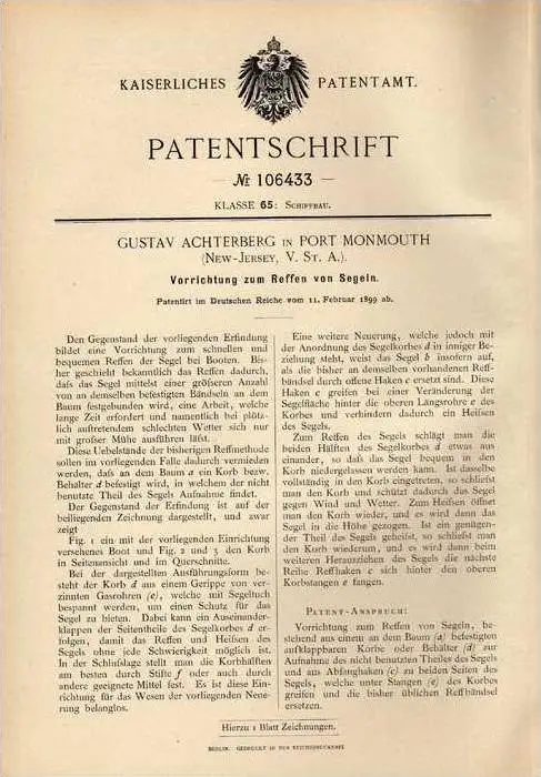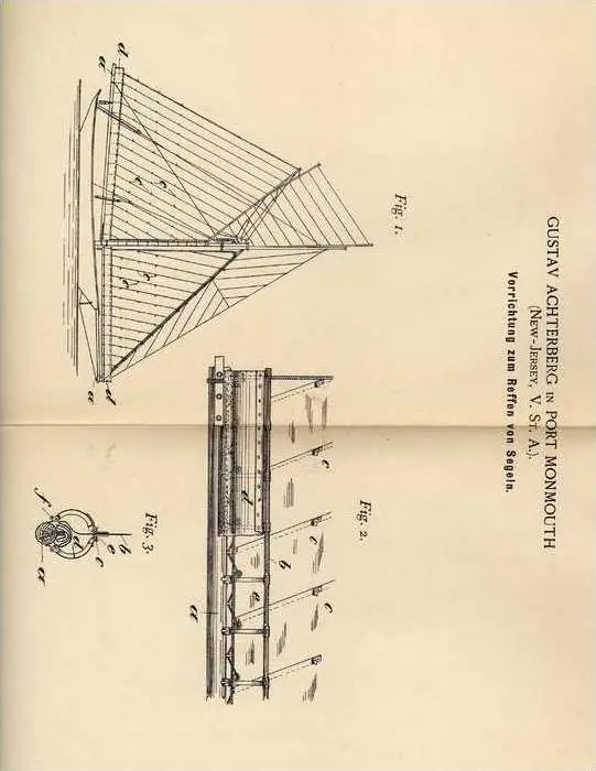 Original Patentschrift - G. Achterberg in Port Monmouth , USA , 1899 , Segelschiff , Segelboot , Segeln , Reffen !!!