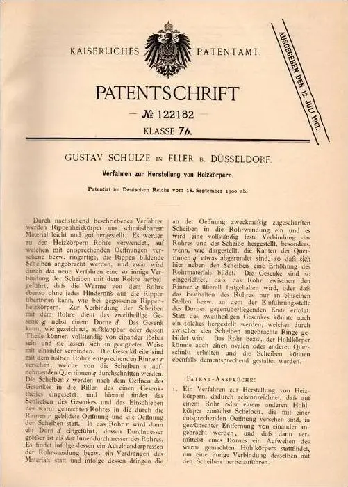Original Patentschrift - G. Schulze in Eller b. Düsseldorf , 1900 , Heizkörper - Herstellung , Heizung , Heizungsbau !!!