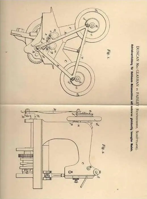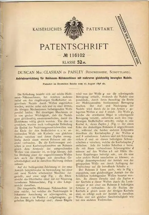 Original Patentschrift - Hohlsaum Nähmaschine , 1898 , D. Glashan in Paisley , Schottland !!!