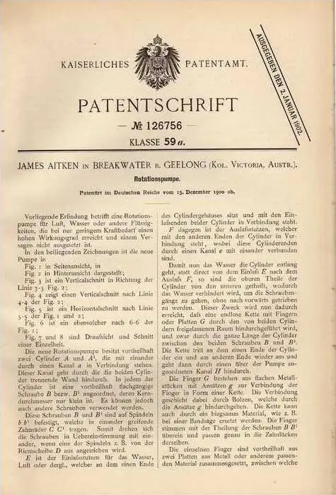 Original Patentschrift - J. Altken in Breakwater b. Geelong , 1900 , Rotationspumpe !!!