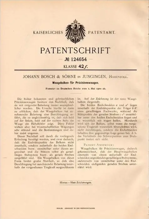 Original Patentschrift - J. Bosch in Jungingen b. Hechingen , 1900 , Präcisionswaage - Waagebalken , Waage !!!