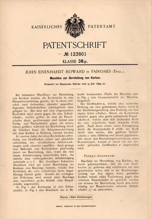 Original Patentschrift - J. Howard in Fair Oak , 1899 , Machine for the production of cork !!!