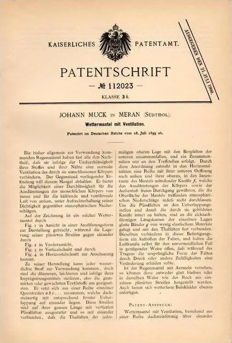 Original Patentschrift - J. Muck in Meran , Südtirol , 1899 , Wettermantel mit Ventilation , Mantel !!!