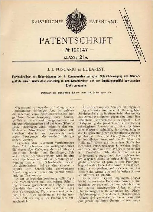 Original Patentschrift - J. Puscariu in Bukarest , 1900 , Fernschreiber , Telegraph , Telegraphie !!!
