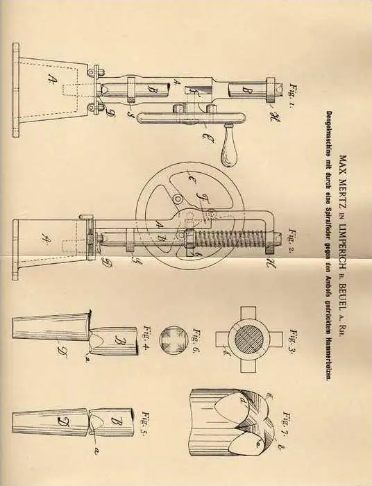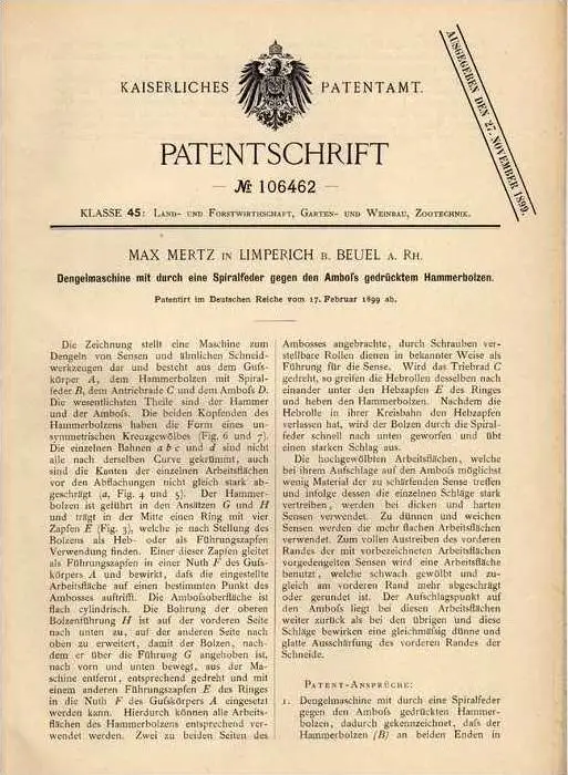 Patent: Dengelmaschine mit durch Spiralfeder gegen dem Amboß gedrückten Hammerbolzen