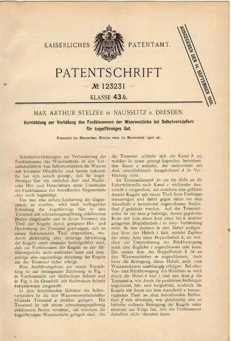 Original Patentschrift - M. Stelzer in Nausslitz b. Dresden , 1900 , Selbstverkäufer , Verkaufsapparat !!!