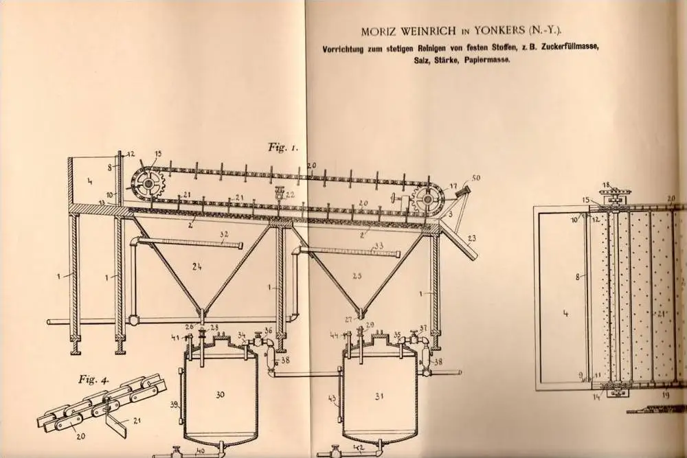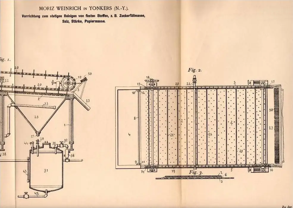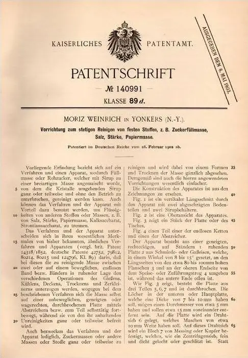 Patent: Vorrichtung zum stetigen Reinigen von Zucker - Füllmasse , Salz , Stärke und Papuer