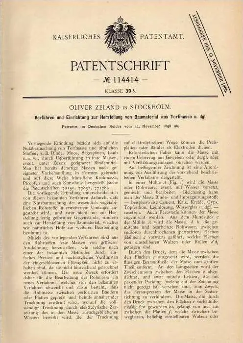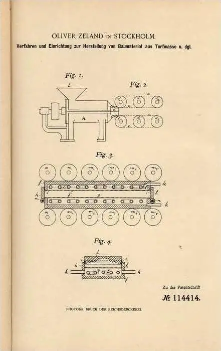 Original Patentschrift - O. Zeland in Stockholm , 1898 , Herstellung von Torf - Baumaterial , Hausbau , Maurer !!!