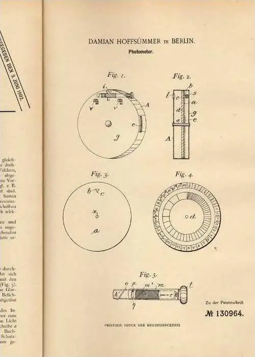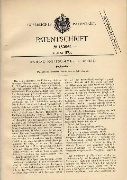 Original Patentschrift - Photometer , Photographie , 1899 , D. Hoffsümmer in Berlin !!!